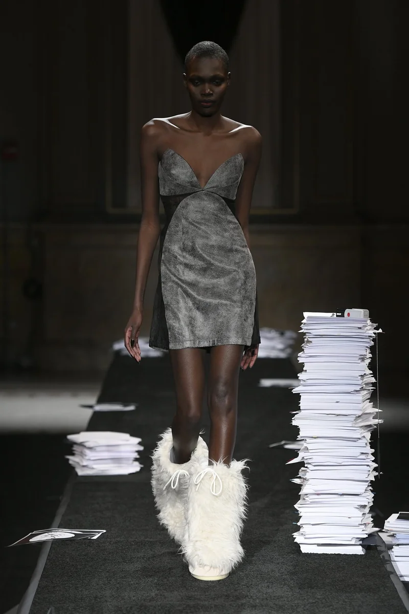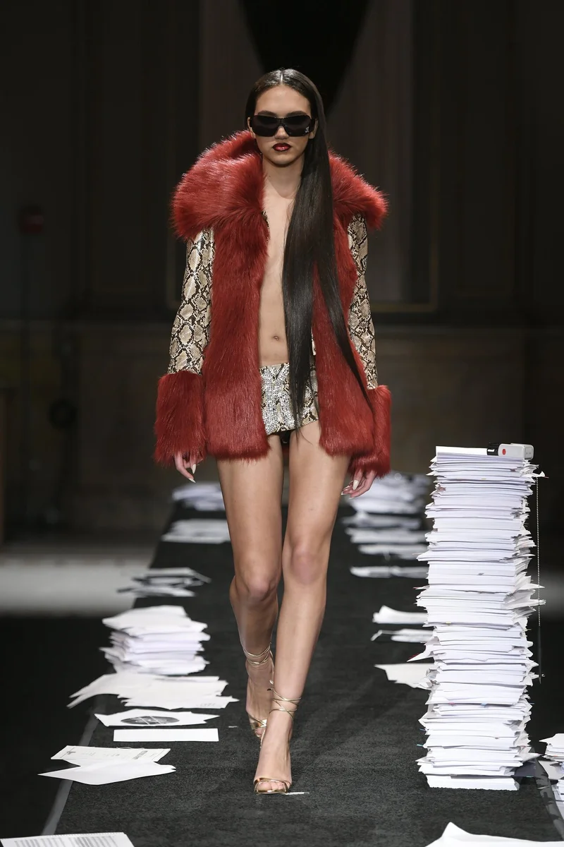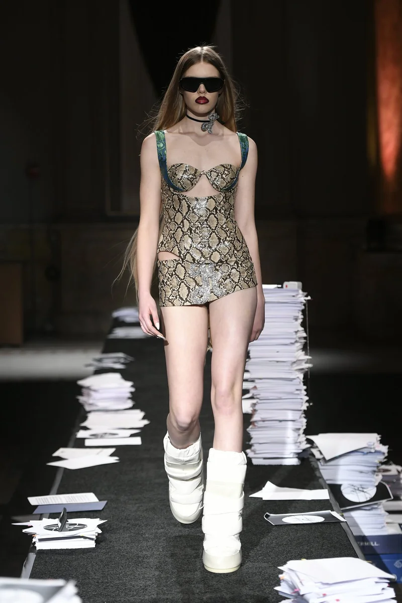 Анималистичные принты пробрались и в коллекцию Kim Shui. Кожаный корсетный топ с яркими лямками выглядит стильно, а вот юбка все-таки слишком "мини".