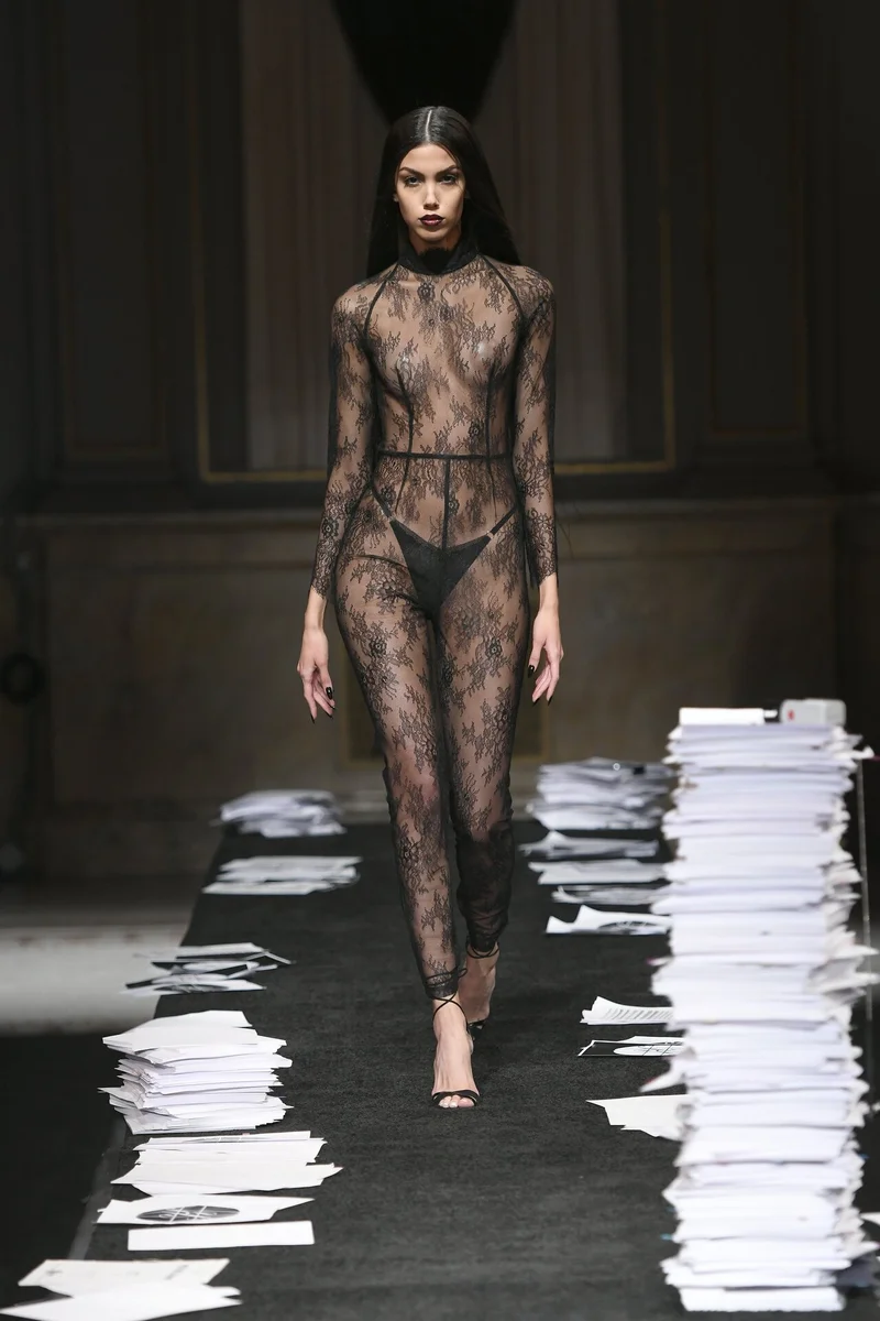 Без комбинезонов из гипюра, конечно, не обошлось. Было бы интересно дополнить это образ меховым пальто.