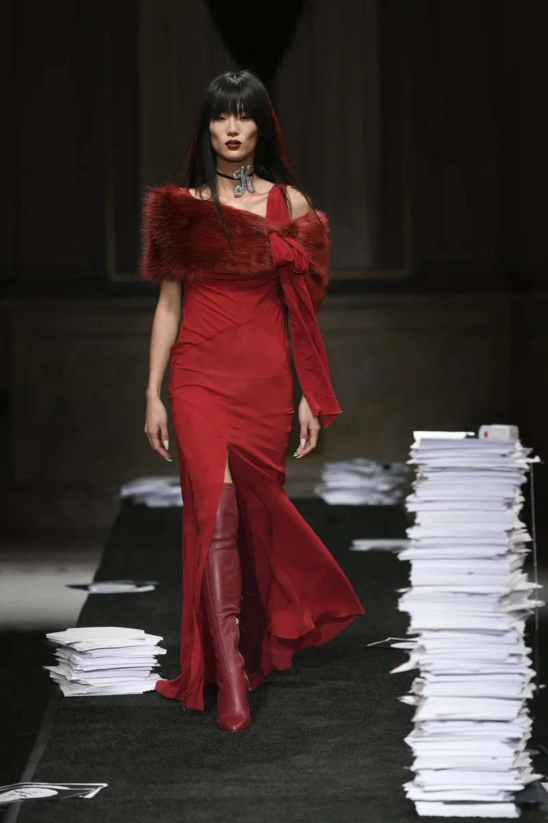 В линейку вошло несколько красных нарядов - видимо дизайнер готовилась ко Дню всех влюбленных. Платье с вырезом и меховой накидкой смотрится очень эффектно. А кожаные сапоги-чулки прекрасно дополняют образ.