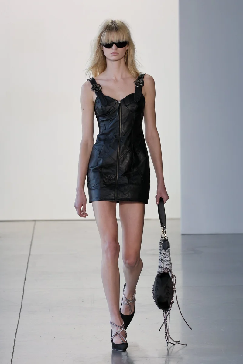 Черное мини из кусочков кожи на молнии напоминает образы 90-х. Широкие бретельки с металлическими цветками - удачный выбор для подобного наряда.