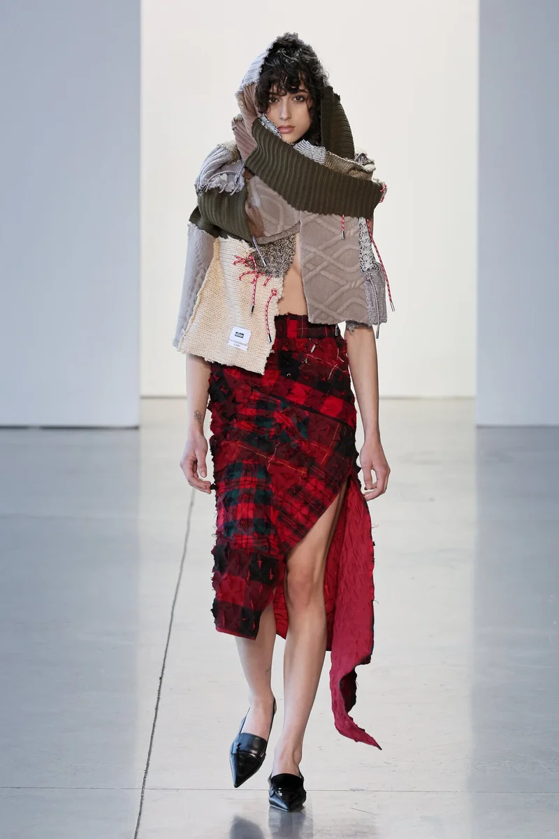 Образ из клетчатой ассиметричной юбки и объемного шарфа в стиле пэчворк смотрится необычно. Ul:kin также используют много ярких шнурков в своих нарядах.