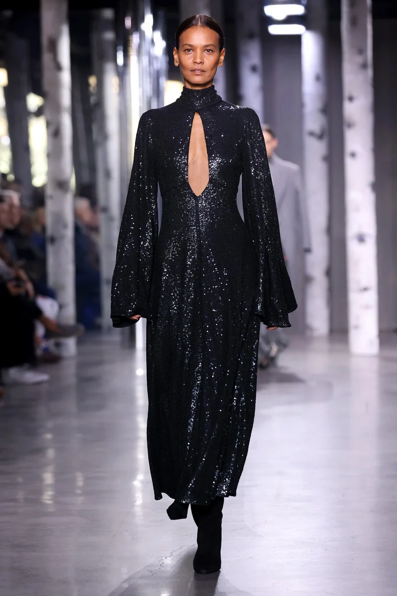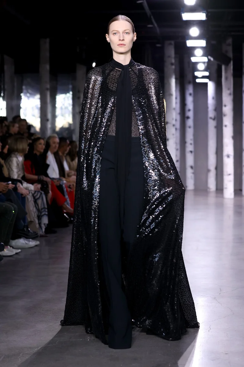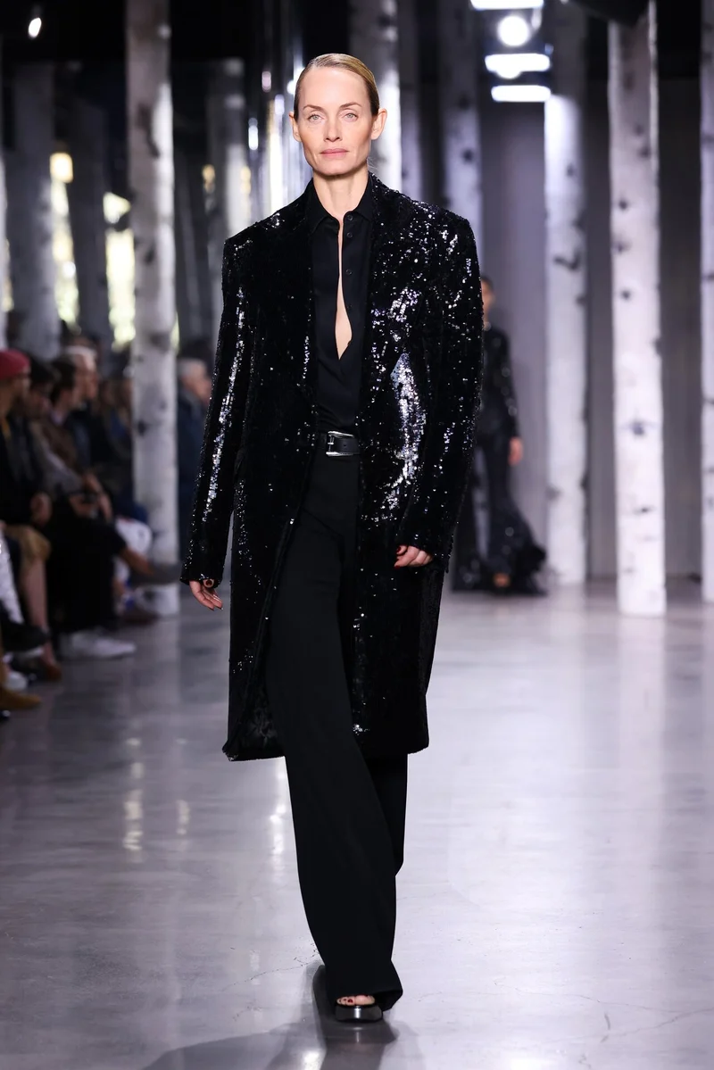 Стоит отметить, что в качестве декора заметны только пайетки. Чаще всего дизайнер использовал приглушенные цвета и не слишком плотное распределение на ткани. Редкое исключение - образ легендарной Амбер Валлетты: ее классическое черное пальто заметно блестит.