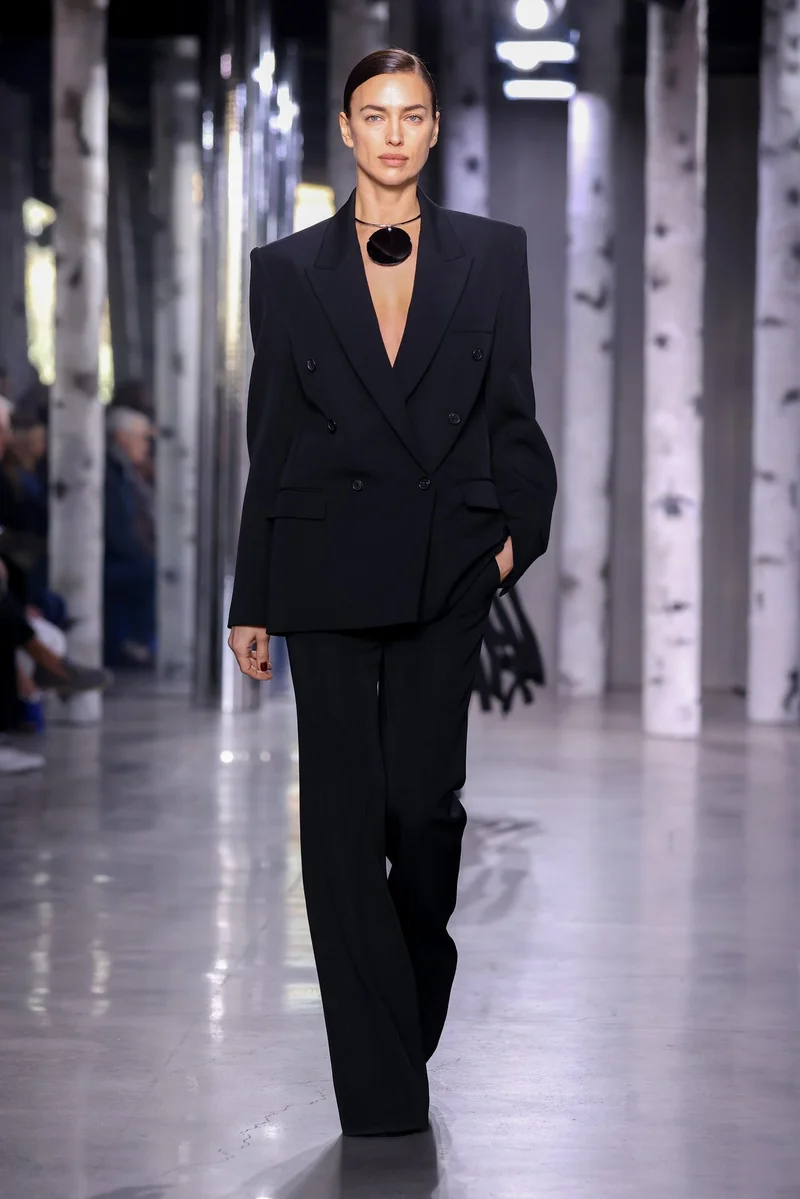 В показе приняла участие Ирина Шейк. Ей достался лаконичный черный костюм с брюками и свободным пиджаком. Образ дополнен колье с большим круглым медальоном. Кстати, подобные украшения демонстрировали многие манекенщицы.