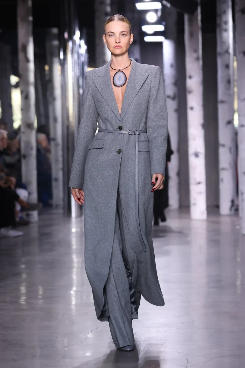 Знаменитая модель Малгоша Бела продемонстрировала пальто приятного серого оттенка на двух пуговицах. Образ дополнен тонким ремнем в цвет и очередным кулоном.