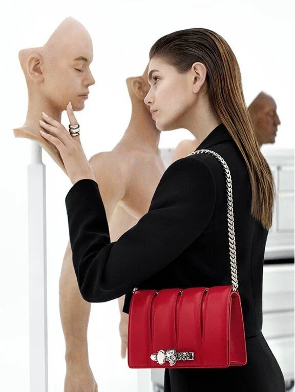 Короткий рекламный ролик завораживает - Кайя Гербер в слепяще-белой комнате находит манекен со своим лицом, гладит его и плачет. На протяжении всего видео у нее на плече новая сумка Alexander McQueen.