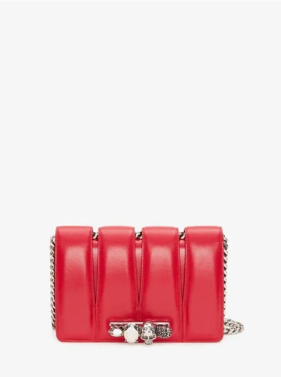 Новый аксессуар Slash Bag сделан из красной кожи и украшен узнаваемыми символами бренда - кулаком и черепом с кристаллами Swarovski. Ручка сумки выполнена в виде серебряной цепочки.