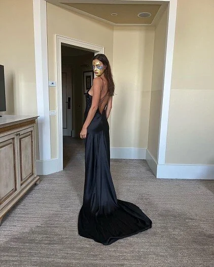В кадре знаменитость предстала в чёрном платье в пол с небольшим шлейфом и открытой спиной. Оно позволило ей продемонстрировать шикарную фигуру. Для завершения образа Ирина нанесла на лицо золотую маску и использовала патчи.