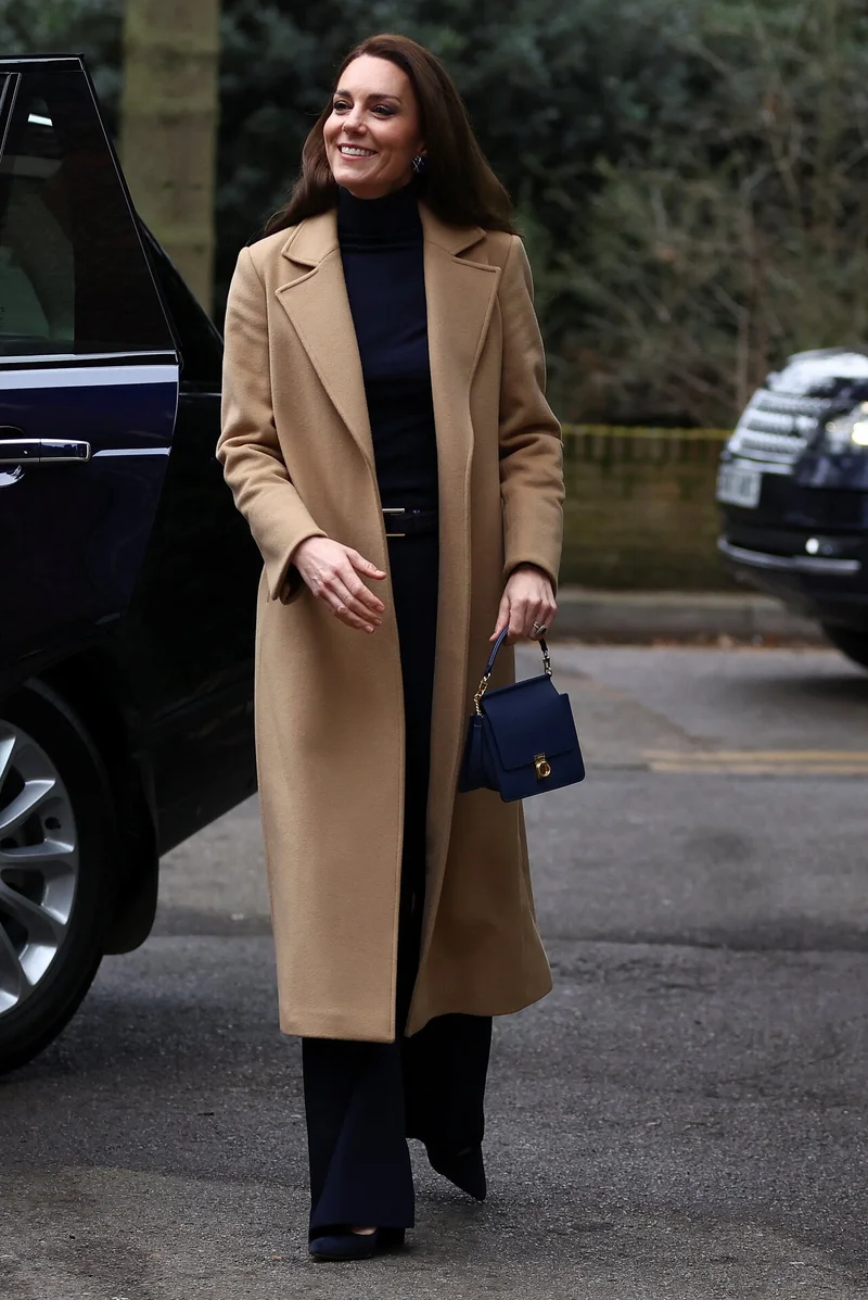 Для очередного королевского выхода жена принца Уильяма составила комплект из кашемирового джемпера от Kiltane и свободных брюк с высокой посадкой от Jigsaw. Всё — тёмно-синего оттенка.