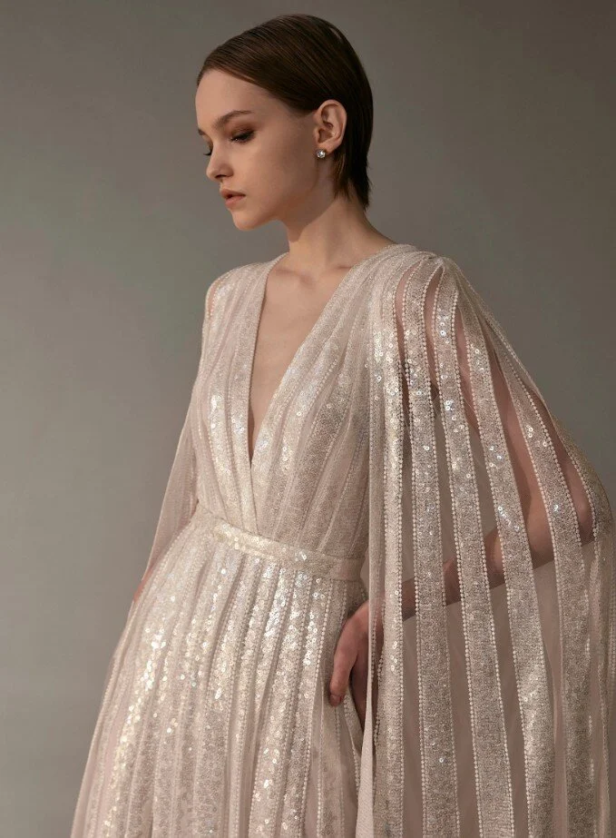 Платье с V-образным вырезом и полосками из полупрозрачных пайеток.