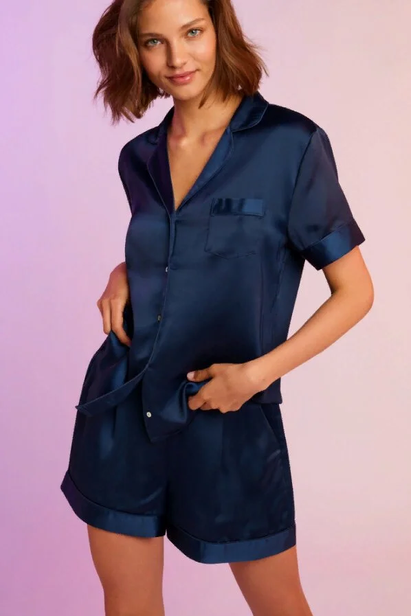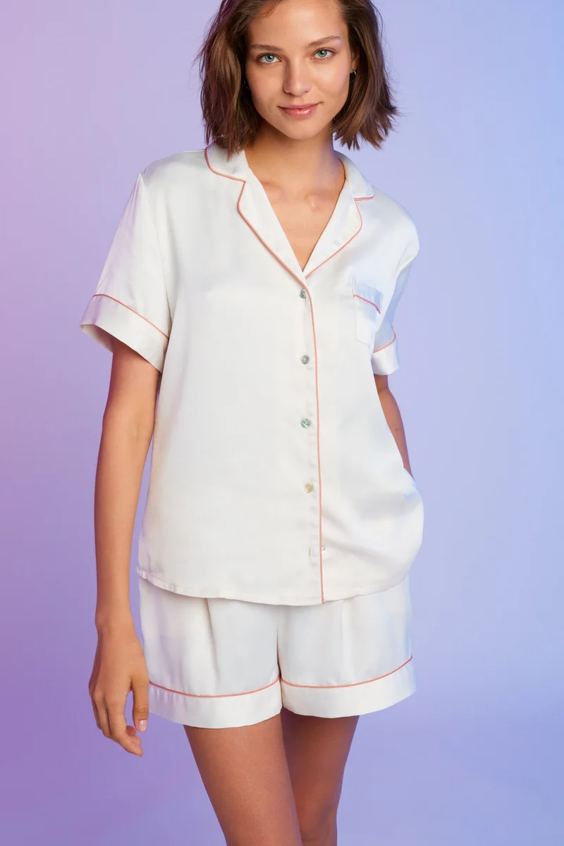 Бренд перевыпустил свою атласную пижаму GIA - теперь это свободные шорты и рубашка с коротким рукавом. Новая версия представлена в четырех цветах: белый, нежно-голубой, глубокий синий и бежевый. Края пижам отделаны контрастным кантом - выглядит довольно стильно и интересно.