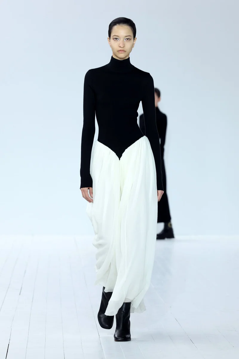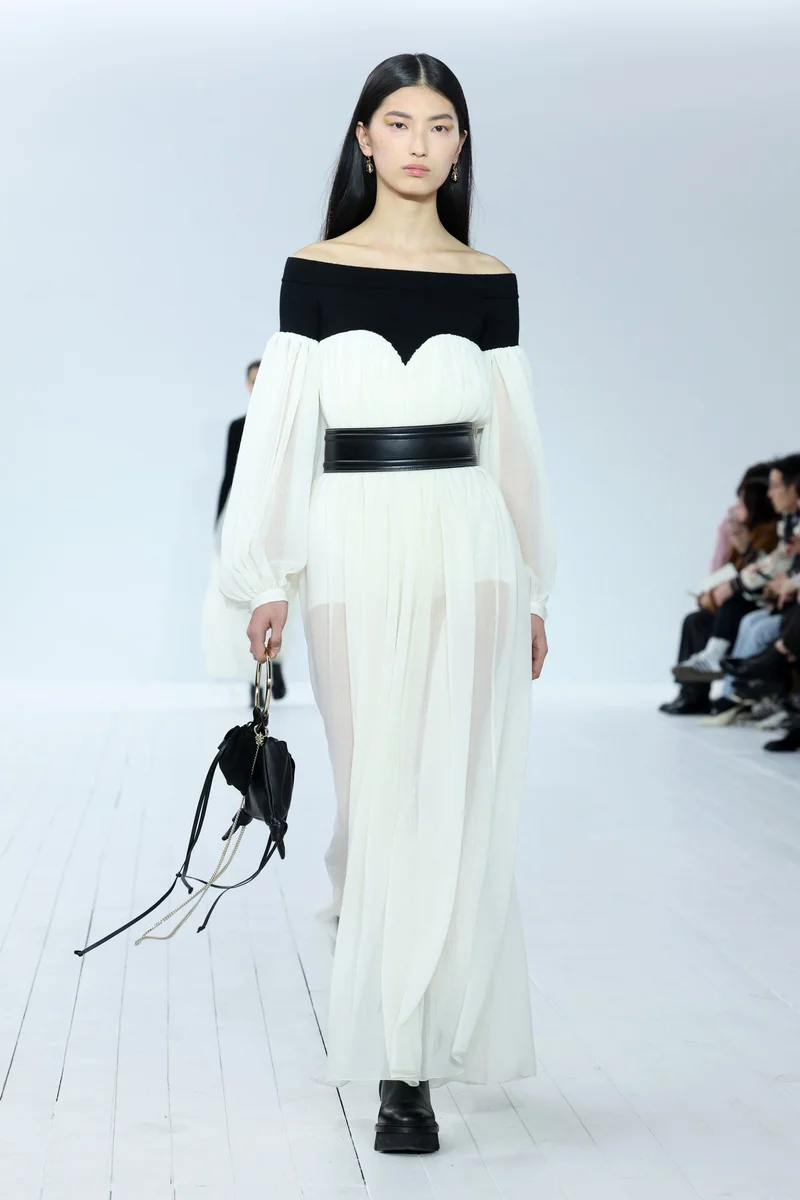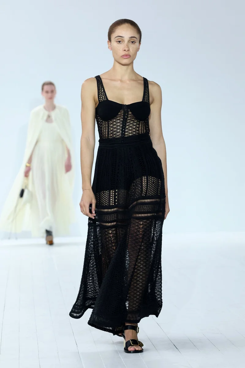 Один из самых нежных образов показа - полупрозрачное платье с трикотажным верхом. Такая непривычная деталь делает наряд более уверенным. Не обязательно быть принцессой, чтобы носить воздушные платья.