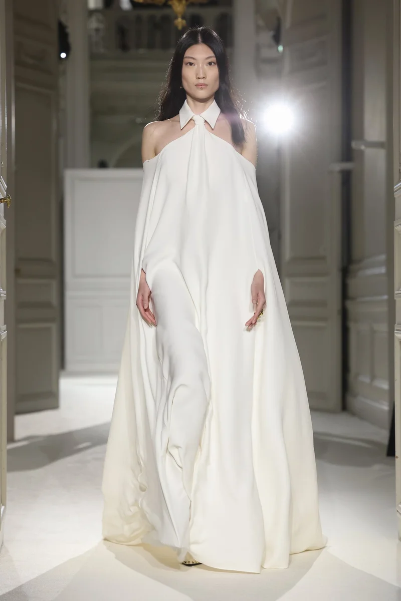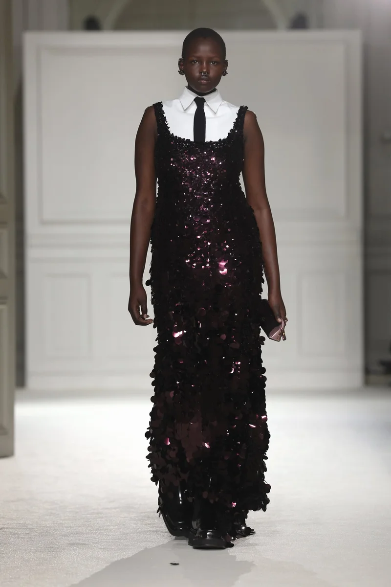 Очень красиво смотрятся наряды из крупного декора с классическими воротниками и манжетами. Актуальный в этом сезоне градиент, также промелькнул на этом показе. Серое жемчужное платье с вырезом смотрится просто шикарно.