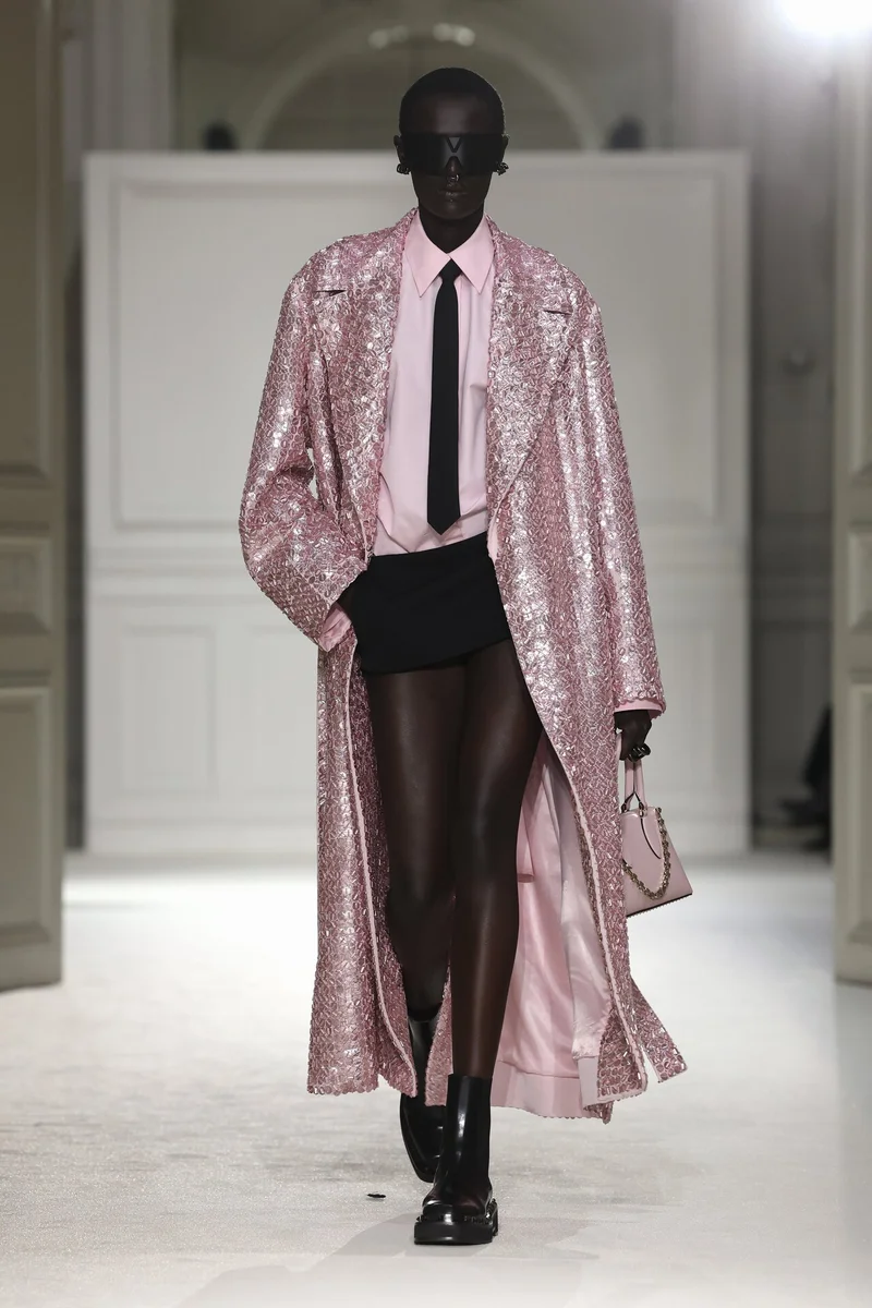 Блестящее нежно-розовое длинное пальто просто поражает воображение. Образ получился удивительно гармоничным и эффектным.