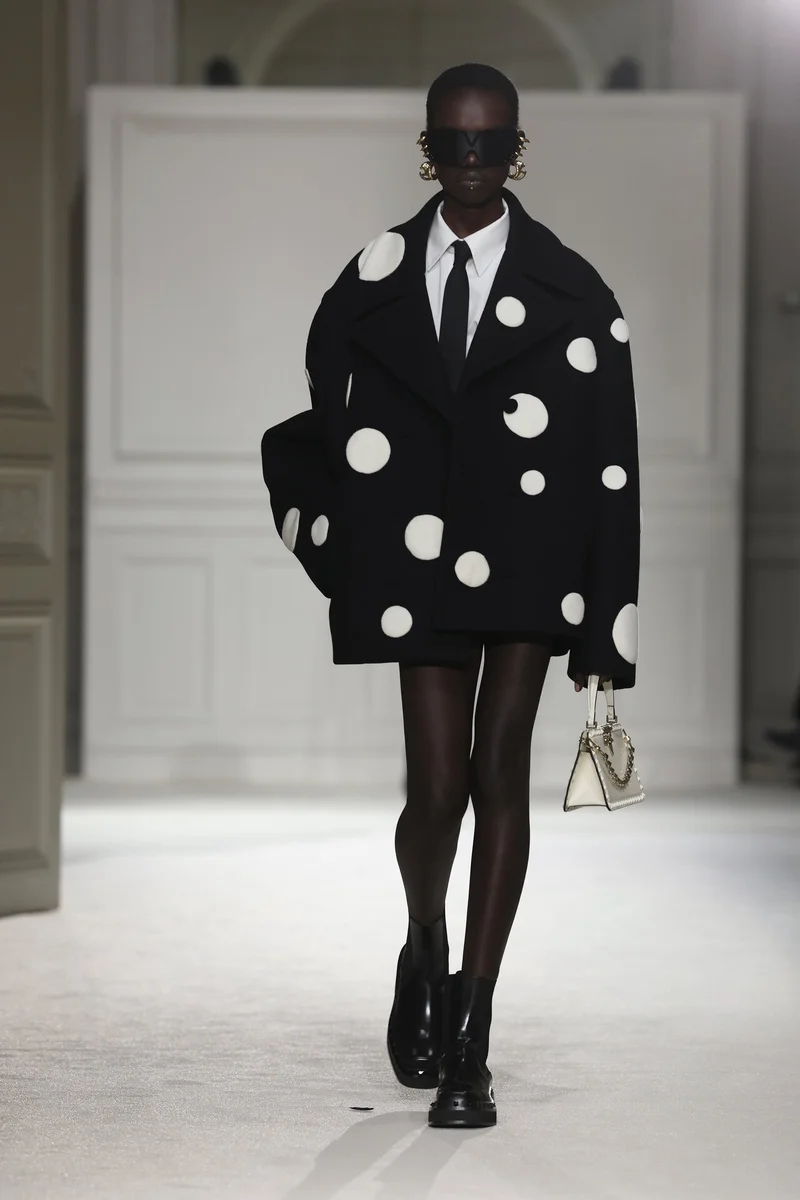 Объемные пальто и пиджаки дополняют женственные образы. Принт в разнокалиберный горох отлично гармонирует с классической рубашкой. Пожалуй, такое пальто можно носить и с обычными джинсами.
