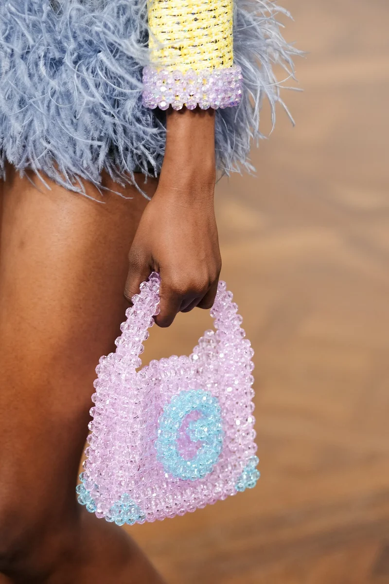 Уже знакомые всем бусины представлены в виде крупного бисера, который украшает большинство нарядов. Также в коллекцию вошли милейшие плетеные сумочки.