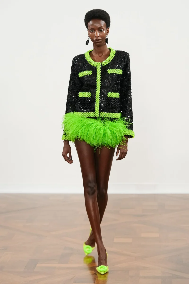 Всем знакомый дизайн жакета в таком исполнении стал смотреться совершенно по-новому. А пушистая юбка добавляет образу неуловимую свободу.