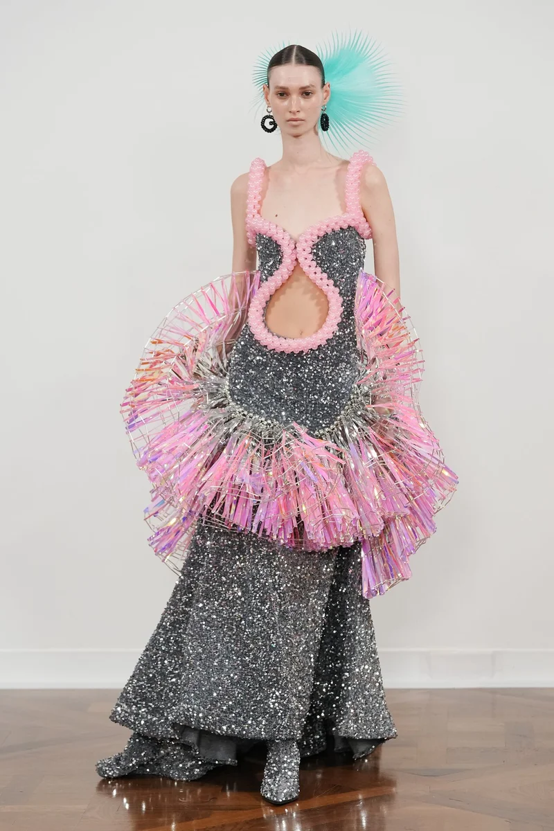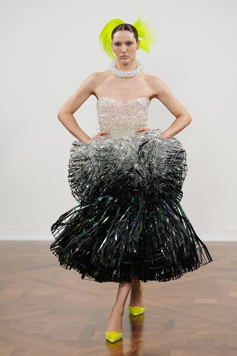 В этом году Germanier продолжает демонстрировать невероятные эксперименты с декором, правда юбок в виде пипидастра уже не наблюдается. Зато появилось больше блестящей мишуры и фактурных тканей.