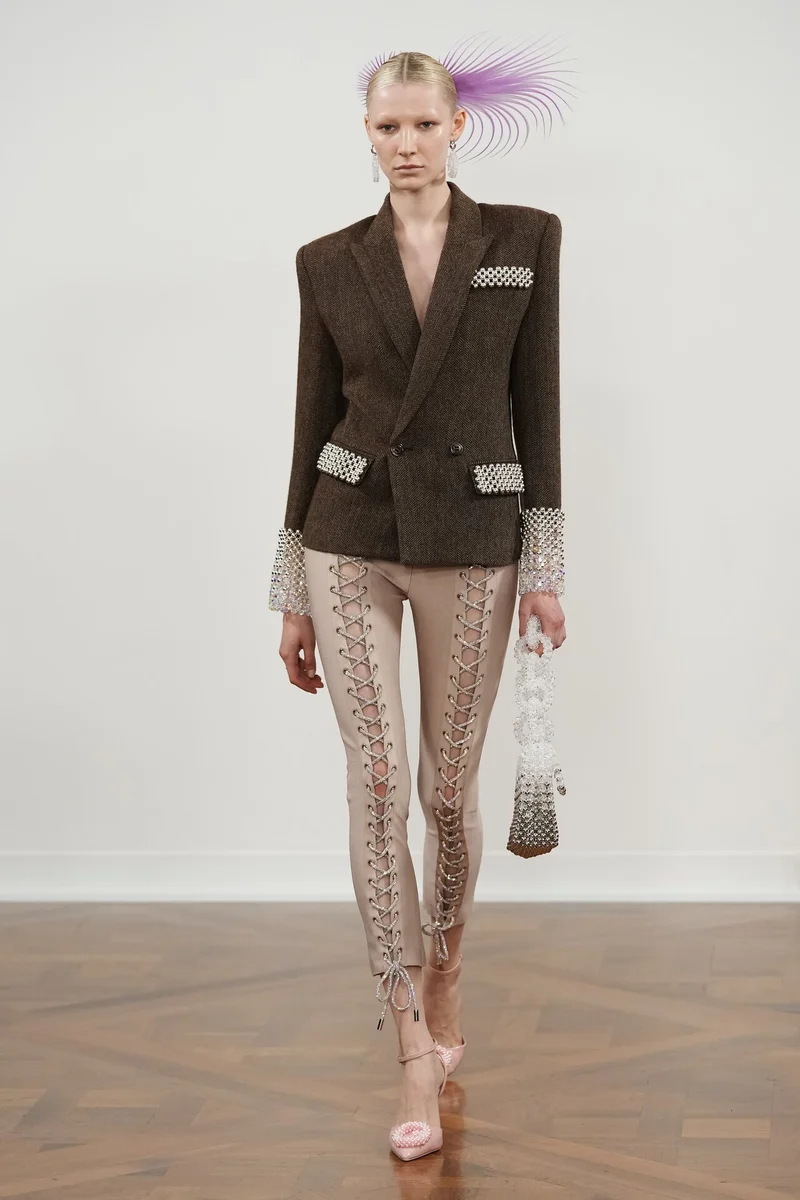 Шнуровка на узких брюках и сапогах стала еще одной запоминающейся деталью. Бежевые брюки отлично сочетаются с коричневым пиджаком и нежно-розовыми туфлями.