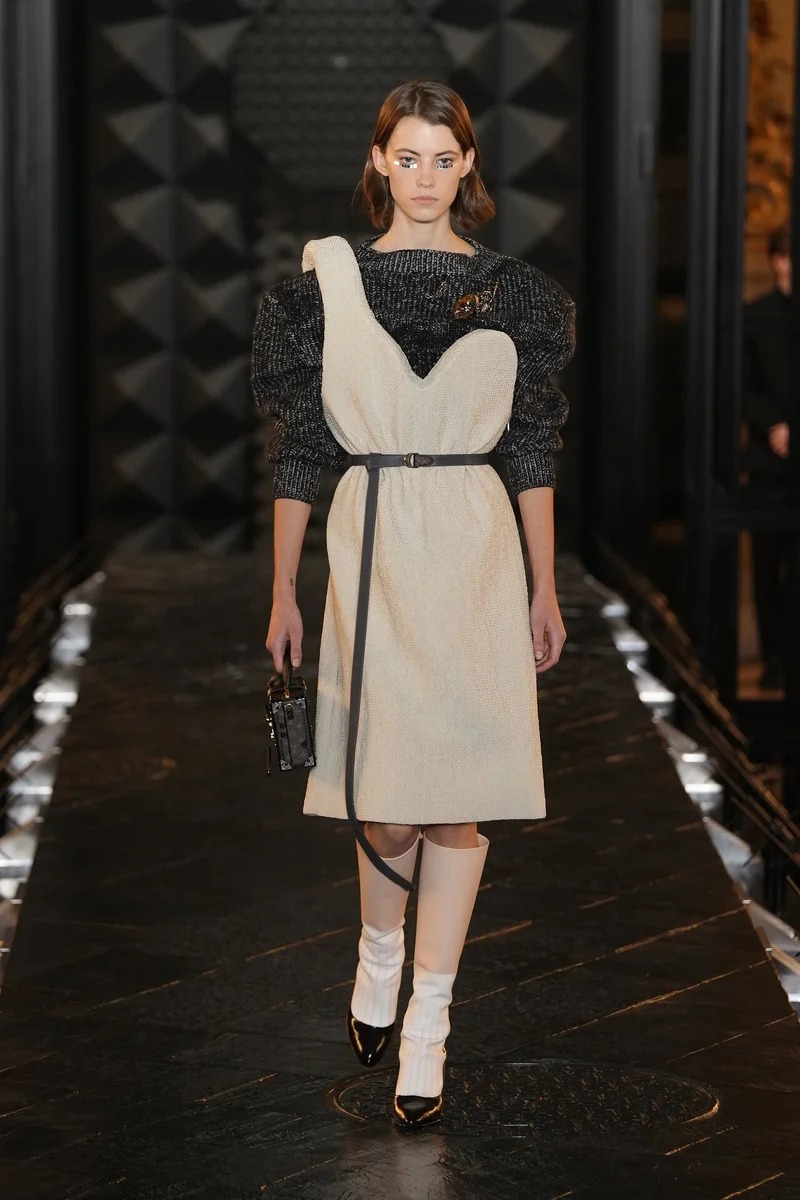 Ассиметричные платья дизайнер предлагает дополнять не только поясом, но и сочетать с объемными свитерами. Брошь в качестве украшения также входит в образ. Трехцветные сапожки повторяют образ лаковых туфель с носочками - очень мило.