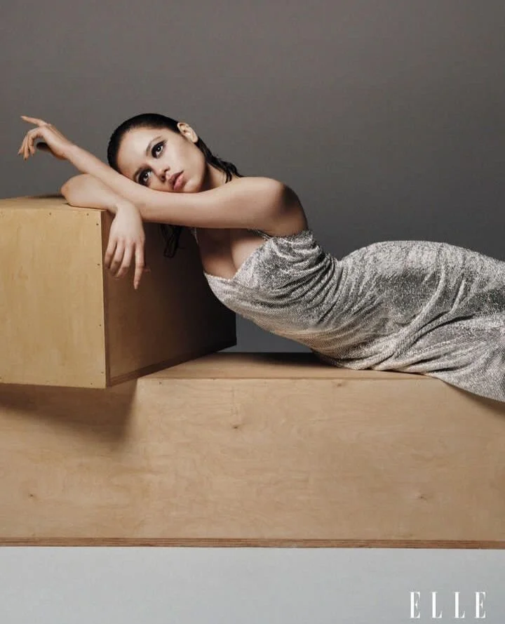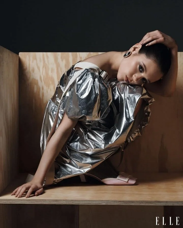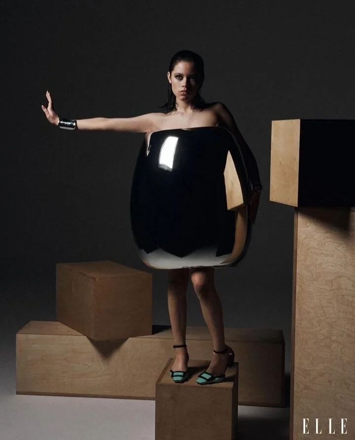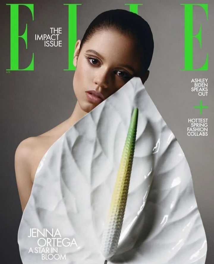 Для фотосессии Elle, Хезер Роббинс и Мэри Гоунор решили разнообразить образы молодой знаменитости и показать ее совершенно по-новому. Одним из самых удивительных нарядов стал вирусный топ Loewe в виде цветка антуриума.