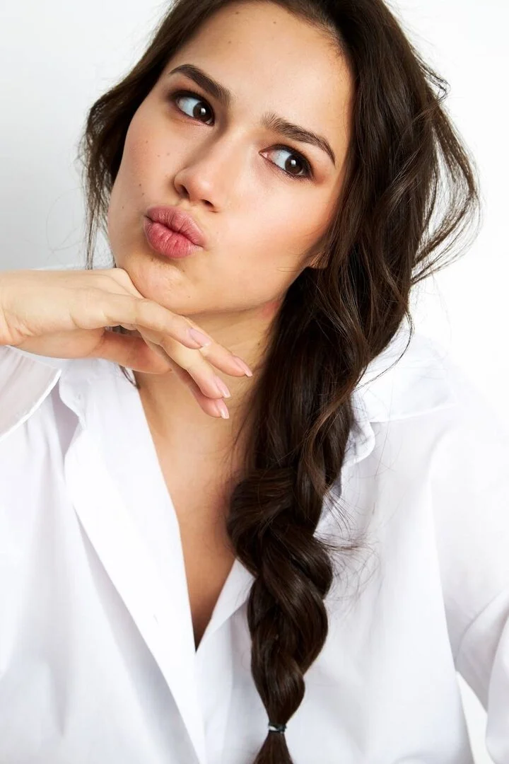 Волосы она собрала в косу, оставив несколько прядей выбивающимися из причёски. Завершил образ естественный макияж. Для его создания Алина использовала блеск, придавший губам немного глянцевого сияния, и тени розового и коричневого оттенков.
