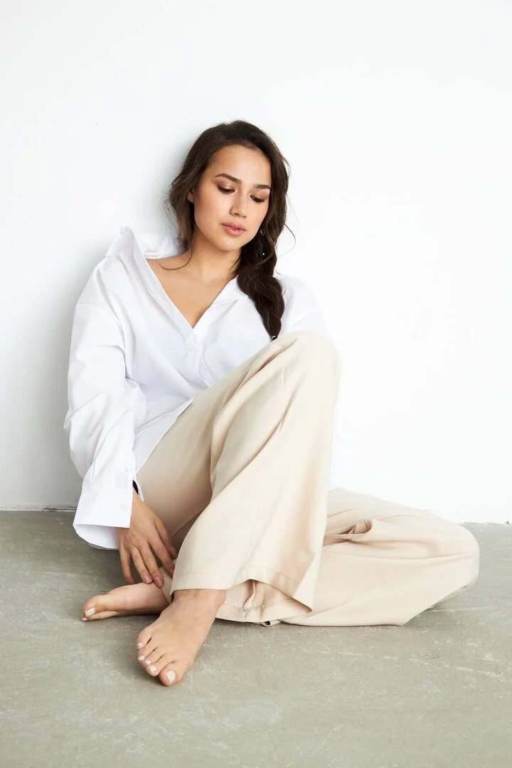 Алина позировала фотографу в белой свободной рубашке и светло-бежевых широких брюках с высокой талией. Спортсменка оставила расстёгнутыми пуговицы на манжетах, что добавило образу, состоящему из строгих вещей, чуть-чуть легкомысленности.