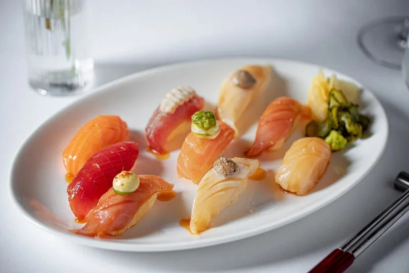 По желанию гостя блюдо могут приготовить без риса. Ломтики вагю, тунца или лосося выкладываются на основу из белой спаржи и цветной капусты. Сочетание непривычное, но попробовать хотя бы один раз стоит.