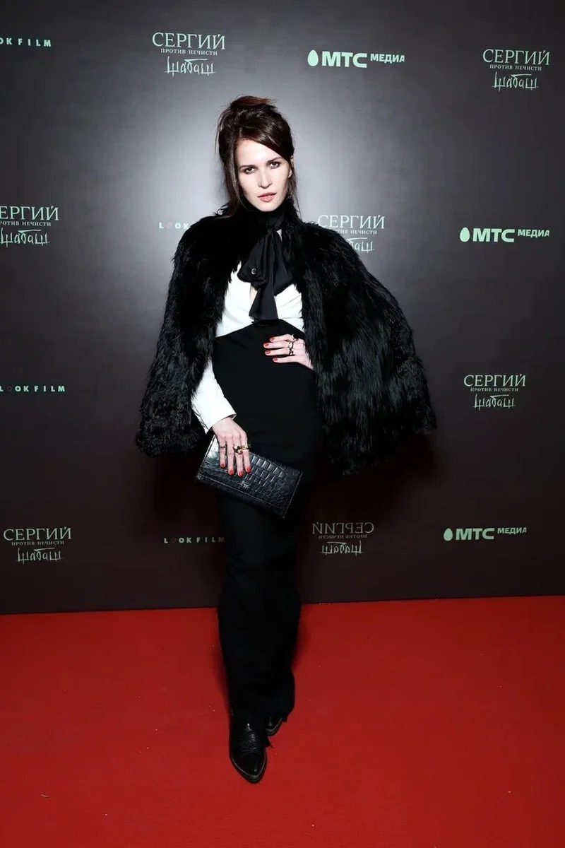 Лукерья Ильяшенко появилась в черно-белом сете с меховой накидкой и шелковым бантом на шее. Несколько мрачный образ напоминает сразу двух персонажей актрисы - следователя Катю и вампиршу Агату.