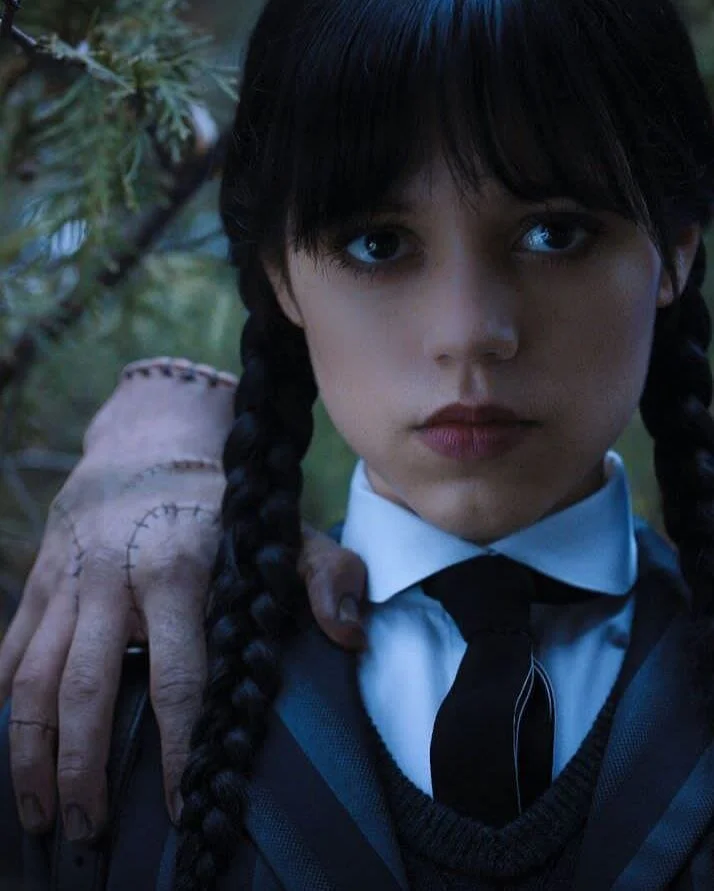 Для роли Уэнсдей актриса сделала челку. Девушка экспериментировала со своим стилистом - они добавляли светлые пряди, делали различные косички. В конце Ортега решила подстричь свои волосы, зная, что у нее есть время их отрастить, если такой образ не подойдет. Режиссеру понравилось.