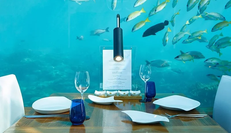 Гости в Ithaa могут поужинать в огромном «воздушном пузыре», окруженном толщей воды. Находясь внутри, не скажешь, что над головой всего 5 метров воды, ведь заведение построено рядом с живописным коралловым рифом и имеет прозрачную крышу. В итоге кажется, что вокруг осталась только вода, наполненная подводными обитателями и растительностью.