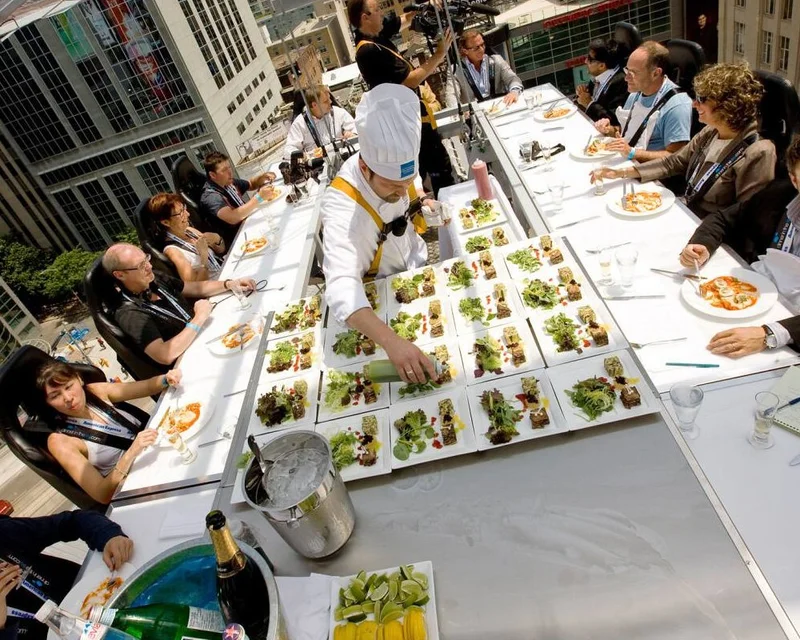 Первое место рейтинга по праву заслужил «Ужин в небесах» - именно так переводится название этого поднебесного международного проекта. Партнеры у ресторана есть в 45 странах мира. В 2021 году Dinner in the Sky был доступен в Санкт-Петербурге. Поэтому выбрать небо, под которым вы будете ужинать, можно в любой части планеты.