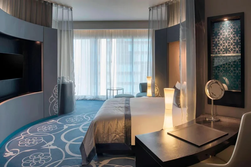 Номера приспособлены под нужды деловых людей: в жилых помещениях оборудованы рабочие зоны. Стоимость суточного проживания начинается от 244 долларов.